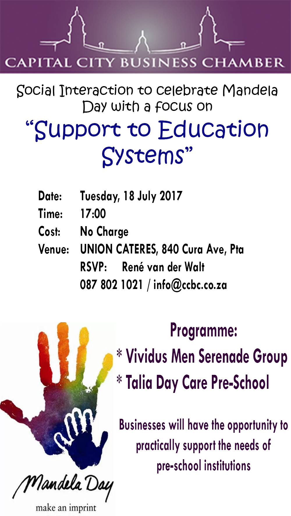 The Capital City Business Chamber (CCBC) is an innovative organization working for the success of the Business Community in the Capital City (Pretoria/Tshwane) of South Africa